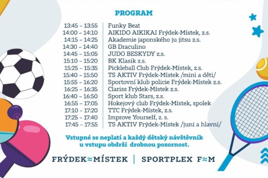 Trh sportu se uskuteční 31. května od 13:00 do 18:00. Zájem projevilo 33 sportovních oddílů a kroužků. Každý z nich dostane v hale prostor pro své stanoviště, vyjma hasičů, které návštěvníci najdou před budovou. „Jednotlivé oddíly představí svou činnost ve formě ukázek daného sportu. Pokud někoho z návštěvníků určité sportovní odvětví zaujme, bude moct na stánku získat více informací a domluvit se na návštěvě klubu a začátku tréninků. Všechny děti a rodiče srdečně zvu,“ dodal primátor Frýdku-Místku Petr Korč. Celý program bude moderovat moderátor.