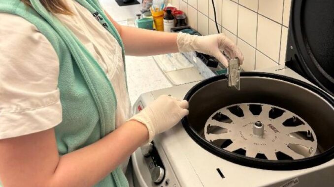 Cytocentrifuga je špičkové zařízení určené k přípravě tenkých vrstev buněk z biologických vzorků, jako jsou krevní nátěry, moč, mozkomíšní mok a další tekutiny. „Do malé nálevky dáte vzorek a tím, jak se centrifuguje, vsakuje přebytečnou tekutinu filtrační papír a vzorek (buňky) zůstává na podložním skle soustředěný do jednoho místa. Díky novému přístroji je tak vzorek rovnou připraven k barvení a následně diagnostice. Nahrazuje manuální rozetření nátěru,“ popisuje práci u přístroje vrchní laborantka Hana Bláhová.