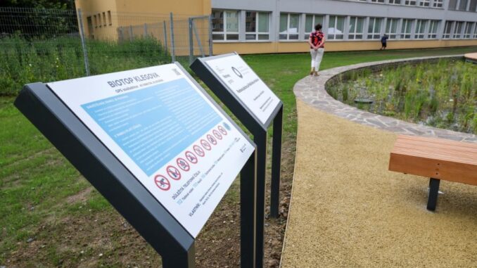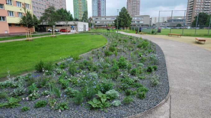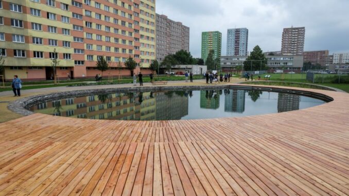 OSTRAVA – Hrabůvka je zase o něco hezčí. Parková plocha u polikliniky se z nevzhledného prostoru proměnila v klidovou zónu, které dominuje unikátní vodní plocha s lehacími platy ze dřeva.
