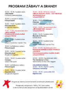 V sobotu 20. července v městském parku ve velkém barevném šapitó bude probíhat workshop cirkusových dovedností pro malé i velké, v hudebním altánu bude znít veselá muzika a budou se vykládat vtipy a na arkádě Spoláku bude Ateliér Frky, kde můžete sami tvořit, nechat si namalovat karikaturu či portrét, nebo si vytvořit klaunskou čepici. Čeká nás také několik unikátních představení – Jirka Hadaš se svým pohádkovým kouzlováním, písničkář Jiří Schmitzer, Roman Blumeier a Saša Stankov s improdivadlem Jukebox nebo akrobatická show Cirkus Trochu Jinak – On The Road.