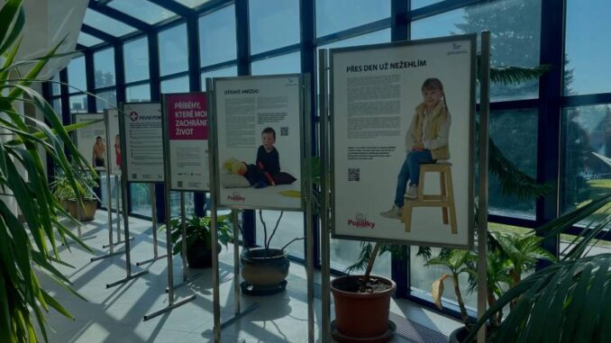„Ve chvíli, kdy byl malý Kubík tři kroky od mámy a chtěl oběhnout ohniště, zakopl o jeden z kamenů kolem plápolajícího ohně a rukama instinktivně předpaženýma se zabořil do žhavých uhlíků. Obličejík skončil v plameni. Andrea u něj byla hned, ale i ta chvilka stačila. Začal boj o minuty. Zatímco nejstarší Jiřík držel v náručí bratříčka křičícího bolestí, máma běžela pro mokrý ručník a než přijela sanitka, tak chladili a chladili. Popálenina nevypadala nijak drasticky, ale když přiletěl vrtulník, Andrea zpanikařila. Kubíka už v umělém spánku odvezli do Brna. Andrea, Kateřina i ostatní děti zůstaly na chatě jak v rozbitém hnízdě samy,“ to je jen kousek jednoho z lidských osudů, které vás na výstavě osloví.