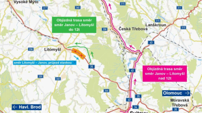 Uzavřena je silnice I/35 v úseku od konce Litomyšle až po křižovatku se silnicí III/03530. Ve směru od Litomyšle se jezdí střídavě po levé i pravé straně silnice. V opačném směru od Svitav do Litomyšle vedou objízdné trasy obcí Janov a Strakov. Objížďka je ale jen pro osobní auta a náklaďáky do dvanácti tun, mimo autobusovou dopravu. Pro náklaďáky nad dvanáct tun vede po silnici ve směru na Lanškroun, dále potom přes Českou Třebovou, Ústí nad Orlicí a vesnici Sopotnice.