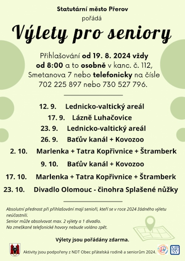 „Přihlášky se otevírají v pondělí 19. srpna a platí, že přednost budou mít senioři, kteří se ještě žádného výletu s městem nezúčastnili – aby se dostalo na více dříve narozených. Každý může využít v letošním roce nabídky maximálně dvou výletů a jednoho divadelního představení,“ nastínil podmínky účasti náměstek přerovského primátora Vladimír Lichnovský s tím, že zájemci o bezplatném výlety se mohou hlásit od 19. srpna od 8 hodin – a to osobně na adrese Smetanova 7, kancelář číslo 112, nebo telefonicky na číslech 702 225 897 nebo 730 527 796. „V případě, že zájemce zvolí telefonickou variantu přihlašování, tak upozorňujeme, že bude-li linka obsazena, na zmeškané telefonické hovory nebude voláno zpět,“ upozornil na závěr náměstek Vladimír Lichnovský.