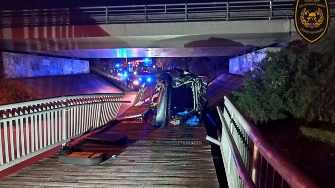 Ten samý trest hrozí i řidiči fabie, který také vlivem alkoholu nezvládl průjezd zatáčkou. Auto porazilo dvě dopravní značky, směrový sloupek a poté narazilo do betonového překladu mostu. Vůz po nárazu sjel z mostu na pěší lávku. Dechová zkouška v tomto případě vykázala 1,96 promile alkoholu.