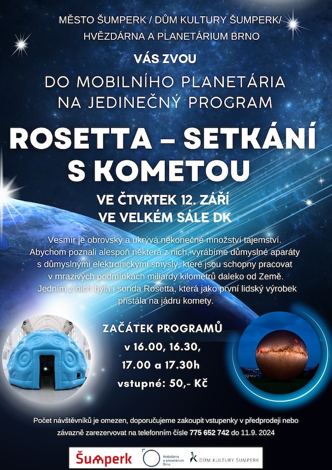 Film o Rosettě nabídne dům kultury i široké veřejnosti, a to 12. září v 16, 16.30, 17 a 17.30 hodin za vstupné 50 korun. Zájemci o navštívení mobilního planetária s projekcí Rosetta – Setkání s kometou můžou zakoupit vstupenky v předprodeji na pokladně domu kultury nebo závazně zarezervovat na telefonním čísle 775 652 742 od 21. srpna 14. hodiny do 11. září.