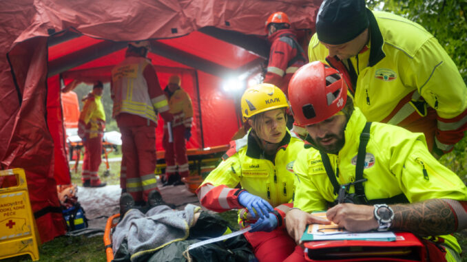 JIČÍNSKO – Tématem cvičení byla záchrana většího počtu turistů ze skalního masivu po neočekávané bouřce, která zasáhla oblast, a simulace skutečné mimořádné události v obtížně přístupném terénu. Cvičení bylo zahájeno v 10 hodin, kdy krajské zdravotnické operační středisko obdrželo několik tísňových volání od turistů, kteří po náhlé změně povětrnostních podmínek uklouzli ze skal a utrpěli zranění po pádu z výšky.
