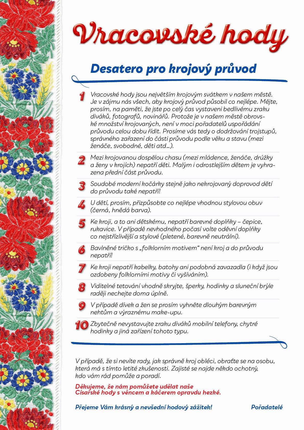 Zároveň by pořadatelé také chtěli požádat všechny majitele, aby svá vozidla neparkovali v ulicích, kterými hodový průvod půjde. Jde o tyto ulice: V sobotu 19. října: náměstí Míru, Nádražní, Okružní, Petra Bezruče, Sportovní, Řadová, Strážnická, Okružní, Na Rybníčku, Jezerní, Komenského a Sokolská. V neděli 20. října: náměstí Míru, Jiráskova, Na Rybníčku, Drahy, Písečná, Lipinská a Okružní. „Děkujeme za Vaši vstřícnost, pochopení a za to, že nám pomůžete udělat hody opravdu hezké. A dámy, pokud si nejste jisté, jak správně obléci kroj, přikládáme instruktážní video,“ popřáli pořadatelé. |