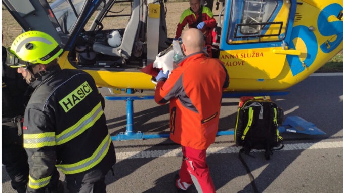 Hasiči, policisté i záchranáři vyjeli k dopravní nehodě motorky Yamaha a auta značky Ford Tourneo. Při střetu utrpěl řidič motorky zranění, se kterým byl letecky transportován do nemocnice. „Jeho spolujezdkyně utrpěla také zranění a do nemocnice ji převezla sanitka. Z auta nikdo zraněn nebyl,“ uvedla mluvčí policie Dita Holečková. Hasiči po příjezdu na místo poskytli první pomoc motocyklistům a po převzetí zraněných záchranáři začali řídit dopravu.