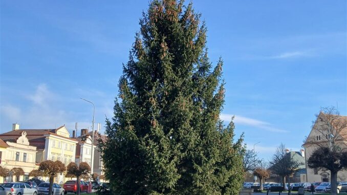 RYCHNOVSKO – Na Kupkově náměstí je již umístěný vánoční strom, který bude slavnostně rozsvícený tuto sobotu při příchodu Mikuláše. Kácení a zdvižení smrku bylo tentokrát poněkud náročnější, protože se jehličnan nacházel blízko elektrických drátů.
