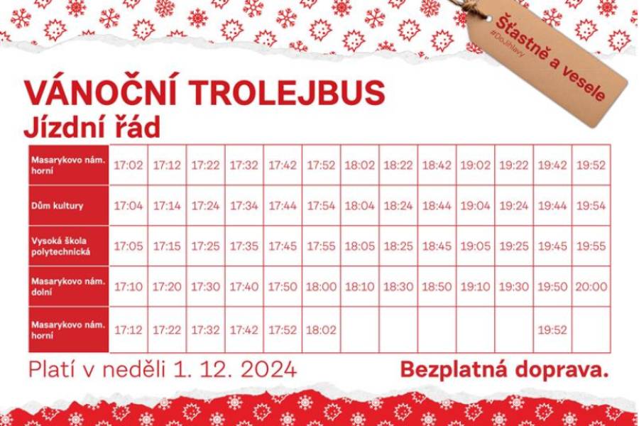 „Vánoční trolejbus bude cestující v Jihlavě vozit až do Tří králů. Vůz bude, kromě první adventní neděle, jezdit po standardních linkách. Jeho aktuální pozici najdete na online mapě MHD, kde bude označen zlatou hvězdičkou,“ popisuje Lucie Maxová z jihlavského magistrátu.