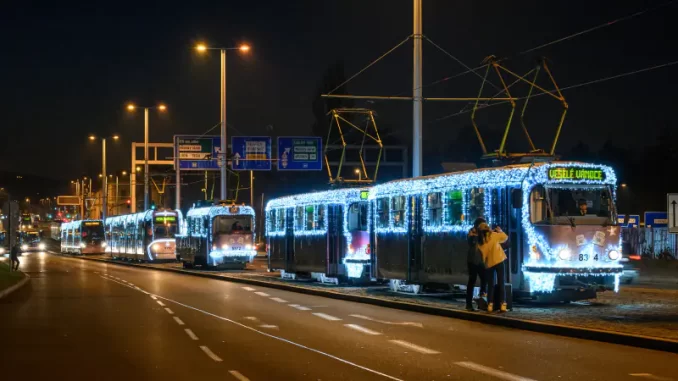 Jaké vozy jsou součástí vánoční flotily? Sedm tramvajových vozů: 15T ev. č. 9401, 14T ev. č. 9170, dvě T3 ev. č. 8304 a 8305, historická dvounápravová tramvaj Ringhoffer ev. č. 2210 s vlečným vozem 1419, ikonická Mazačka ev. č. 5572, dále dva autobusy SOR NB 12 ev. č. 3731 a kloubový SOR NB 18 ev. č. 6966. Tradiční partnery výzdoby je firma DECOLED a studenti Střední průmyslové školy dopravní. Kromě vozů září i Muzeum MHD s vánočním stromem na jeho dvoře.