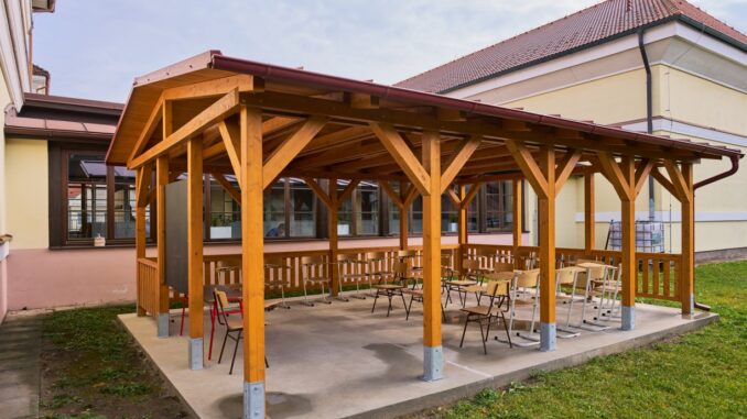 Děti ze základní školy Františka Křižíka v Bechyni využívají od letošního března speciální venkovní učebnu. Jedná se o dřevěnou konstrukci v areálu školy, kde probíhá především výuka přírodovědných předmětů. Do prostoru 5×7 metrů, pod tři metry vysokou dřevěnou konstrukci, se pohodlně vejde celá třída. Děti sedí v lavicích a učitel má k dispozici klasickou tabuli. „Hlavní motivace k pořízení učebny byla možnost výuky přírodovědných předmětů mimo zděnou budovu školy, na čerstvém vzduchu. Slouží nám pro potřeby zpestření výuky, nabízí možnost praktického měření, pokusů a vyhodnocování přírodních jevů během celého roku. Pořídili jsme ji díky dotacím z Evropských peněz, sami bychom na takový projekt finance v rozpočtu nikdy nenašli,“ uvedla ředitelka školy Ivana Voborníková.
