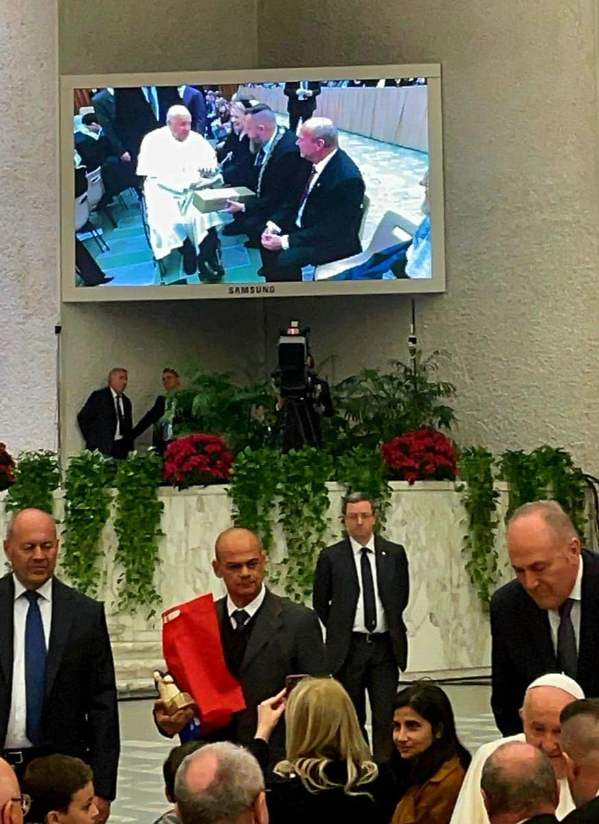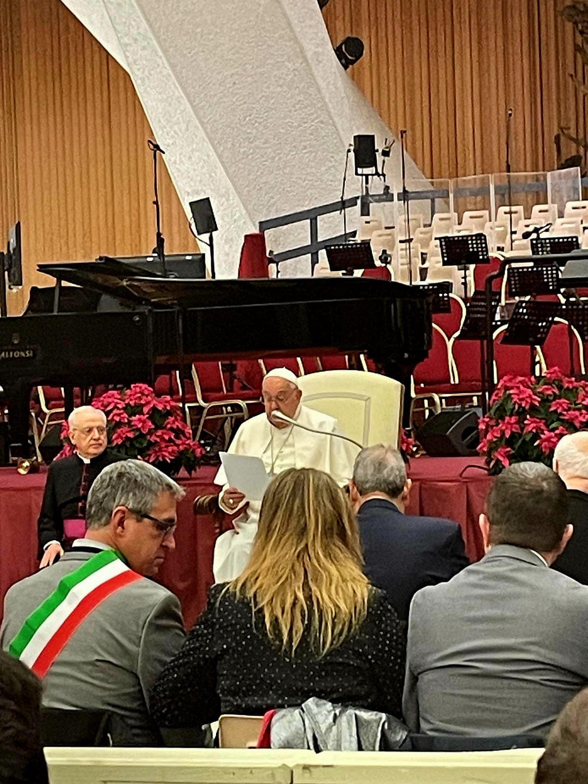 Program začal v sobotu audiencí u papeže Františka v Sále Pavla VI., kde starosta Jan Konvalinka předal papeži dar od všech Příbramanů – ručně vyřezávanou sošku Panny Marie Svatohorské. Večer pak na Svatopetrském náměstí zazářil 29metrový vánoční strom a byl odhalen betlém, který letos připomíná tradice rybářského života. Atmosféru dotvořilo vystoupení mužského pěveckého sboru Coro Cima d’Oro z Valle di Ledro v nedalekém kostele Santa Maria degli Angeli.