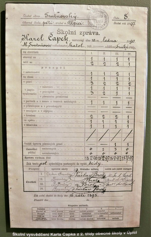 Expozice v přízemí vás vtáhne do Čapkova života – od jeho školních let až po zákulisí jeho literární tvorby. Mezi vystavenými poklady najdete třeba vysvědčení z druhé třídy základní školy z rodné Úpice.