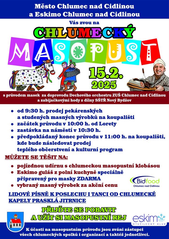 HRADECKO – Tradiční masopustní veselí opět ovládne Chlumec nad Cidlinou. Třetí ročník Chlumeckého masopustu se tentokrát uskuteční v areálu městského koupaliště. Akce proběhne v sobotu 15. února 2025 od 9:30 do 15:00 a nabídne bohatý program pro všechny generace.