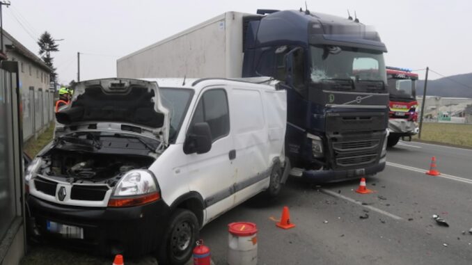 Ve středu 12. února dopoledne před 11:00 hodinou jel po silnici první třídy ve Slavíči u Hranic 41letý řidič v dodávce směrem od Drahotuš. Když projížděl obcí, začal mu z motoru vycházet hustý dým a proto zastavil na čtyřproudové silnici v pravém jízdním pruhu. Se svým spolujezdcem vystoupil z dodávky a oba šli k přední části auta. „V tu dobu jel za ním ve stejném směru a pruhu 45letý řidič s nákladním vozidlem s návěsem, který v důsledku hustého kouře přehlédl před sebou odstavenou dodávku a zezadu do ní narazil,“ sdělila policejní mluvčí Miluše Zajícová. Při nárazu se zranil řidič dodávky i jeho spolujezdec. Řidič byl převezen do fakultní nemocnice v Olomouci a spolujezdec skončil v hranické nemocnici. Dodávka byla odhozena vpravo do protihlukové stěny a ještě do zaparkovaného osobního auta. Dechové zkoušky u obou řidičů byly negativní. Hmotná škoda byla předběžně odhadnuta na 300 000 korun. Policie dále šetří okolnosti nehody.