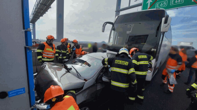 V úterý v poledne zablokovala nehoda autobusu, nákladního a osobního auta přibližně na dvě hodiny dálnici D1 v Brně na 195. kilometru ve směru na Ostravu. Hasiči museli z osobního vozu vyprostit jednoho člověka. „Zranil se muž z osobního auta. Po prvotním ošetření jsme ho k vyloučení dalších možných komplikací převezli do brněnské fakultní nemocnice,“ uvedla mluvčí záchranářů Michaela Bothová. K nehodě došlo v místě, kde stavbaři dálnici rozšiřují na šest pruhů. Hasiči a záchranáři se proto podle svědků k havarovaným vozidlům dostávali s velkými obtížemi, dokonce museli v posledním úseku jít kousek pěšky.