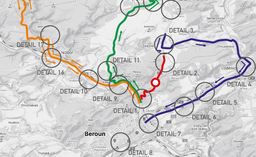 Celý úsek od křižovatky s ulicí Lidická až směrem k Železné bude dočasně nedostupný. Řidiči budou nuceni využít objízdné trasy. Pro osobní vozy a nákladní auta do 6 tun povede objížďka ve směru na Beroun, a to z Železné přes Chrustenice a Loděnice. Směr na Kladno bude zajištěn objížďkou z Berouna přes Hýskov a Chyňavu, zatímco nákladní vozidla nad 6 tun budou instruována využít obousměrnou trasu spojující Beroun s Nižborem, Bělečí, Bratronicemi, Horní Bezděkovou, Kyšicemi a zpět.