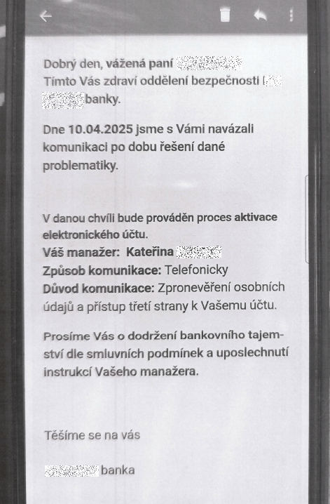 Scénář byl opět podobný jako u všech typů těchto podvodů. Následoval telefonát dalšího muže, který ženu přesvědčoval o nebezpečí napadení jejího účtu s tím, že jí zajistí nový bezpečný účet. Poté ji přepojil na ženu, která se poškozenou snažila instruovat ohledně převodu peněz, ale moc se jí to nedařilo. Následně opět zazvonil telefon, na jehož druhém konci se ozval muž, který ženě pro ujištění zaslal do e-mailu ověření z banky. „Ujistil jí, že se již nemusí bát, protože s ní daný problém vyřeší. Také jí zaslal odkaz. Po rozkliknutí se zobrazila stránka tvářící se jako web banky, na které byly uvedené kontakty údajných zaměstnanců, kteří jí volali. Poškozená tak dle instrukcí převedla na rádoby bezpečný účet celkem tři platby v celkové výši přes 500 tisíc korun,“ sdělila mluvčí policie Kateřina Kubzová.