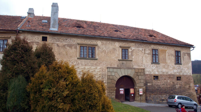 Ve 14. století zde první arcibiskup pražský Arnošt z Pardubic postavil se svým synovcem Smilem Flaškou tvrz, která byla rozšířena na gotický hrad. Ve druhé polovině 16. století přebudoval slezský šlechtic Jiří Pruskovský areál na čtyřkřídlý renesanční zámek, součástí je i gotický kostel sv. Jana Křtitele. Poté se zde střídali majitelé a postupně byl areál zanedbáván, až na konci 19. století došlo k destrukci západního křídla. V roce 1921 převzal budovu stát, nic se ovšem nevylepšilo a v roce 1960 se dokonce schylovalo k demolici…