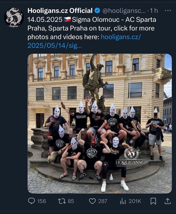 Incident se stal 14. května v Olomouci, kdy se skupina chuligánů fotbalové Sparty Praha v kápích nechala vyfotit u Merkurovy kašny, přičemž někteří z nich měli zvednutou pravici. Fotografie byla zveřejněná na profilu Hooligans.cz Official na síti X, později byla ale smazána. „Olomouckým kriminalistům se podařilo ztotožnit všechny osoby zachycené na fotografii,“ informovala policejní mluvčí Ivana Skoupilová. Případ prověřuje pro přečin projev sympatií k hnutí směřujícímu k potlačení práv a svobod člověka. Nyní se policie obrací na případné svědky, kteří se 14. května v 17:30 hodin nacházeli v blízkosti Merkurovy kašny v Olomouci, aby se přihlásili na bezplatnou linku 158.