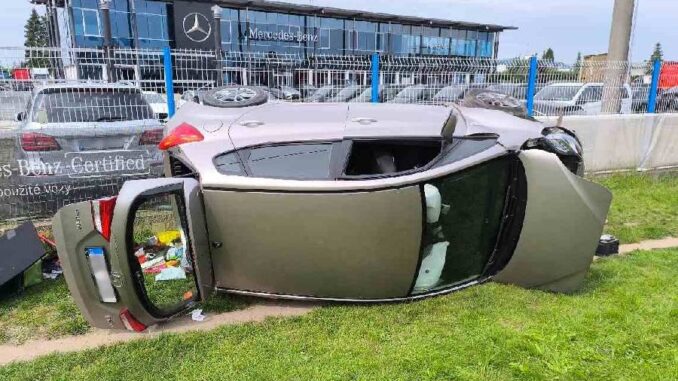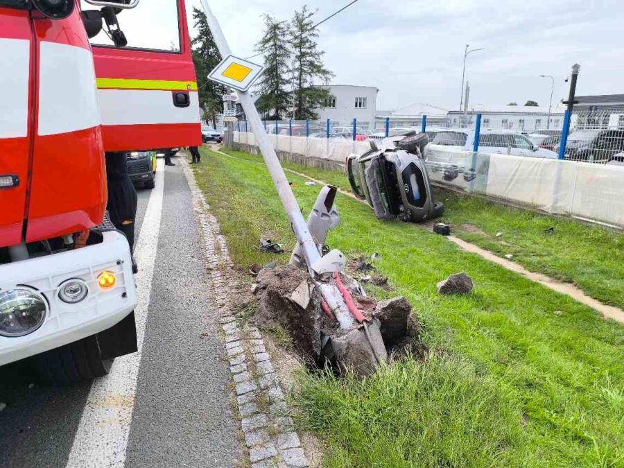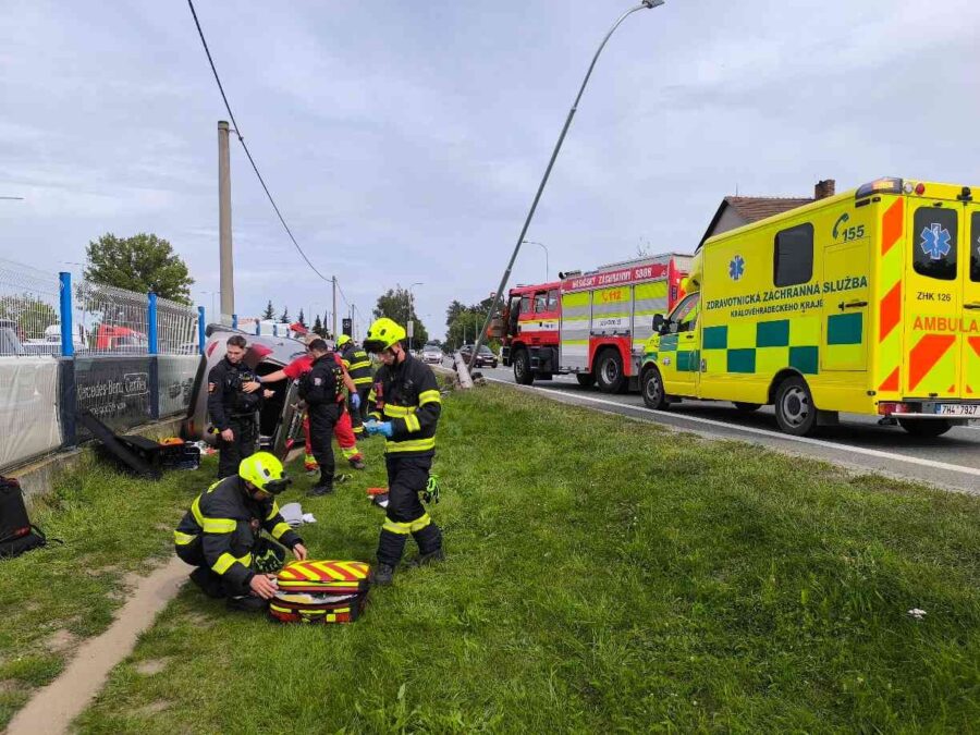 HRADEC KRÁLOVÉ – V sobotu 9. srpna odpoledne zasahovali hasiči v ulici Bratří Štefanů u vážné dopravní nehody osobního automobilu. Podle informací hasičského záchranného sboru vůz vyjel z vozovky, narazil do sloupu veřejného osvětlení a převrátil se na bok, kde zůstal opřený o plot autosalonu.