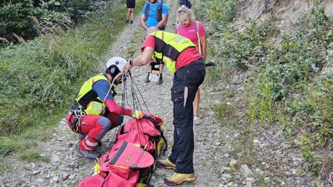 Po čtvrté hodině odpolední v úterý 19. srpna přijali krajští operátoři záchranné služby informaci o starší ženě, která si v horském terénu poblíž obce Komorní Lhotka na Třinecku poranila dolní končetinu. „Vzhledem k obtížné dostupnosti pozemní cestou dorazili na místo horští záchranáři,“ sdělil mluvčí záchranky Lukáš Humpl. Devětašedesátileté ženě zafixovali zraněnou končetinu a zaléčili bolest inhalačními léky tišícími bolest. „Poté požádali o spolupráci záchranářský vrtulník. Lékaře na místo vysadil palubní jeřáb vrtulníku. Letečtí záchranáři přepravili pacientku v transportním vaku na místo mezipřistání, kde ji přeložili na palubu vrtulníku. Seniorku následně předali na urgentním příjmu Nemocnice ve Frýdku-Místku.