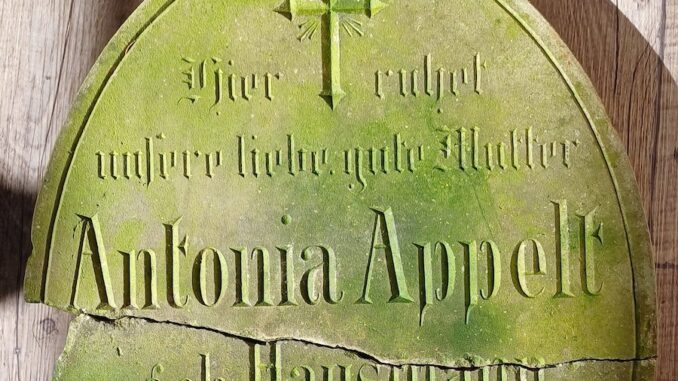 Nález byl řádně zaregistrován do správy města Frýdlant a nyní běží zákonná lhůta, během níž se může přihlásit její vlastník – pokud ještě existuje. Náhrobní deska je vyrobena z pískovce a je rozlomena na dvě části. Na desce je čitelný nápis v němčině, který připomíná Antonii Appelt, rozenou Hausmann, zemřelou 28. března 1906 ve věku 61 let. Pod nápisem je vytesán i text „Ruhe sanft!“, tedy „Odpočívej v pokoji!“.
