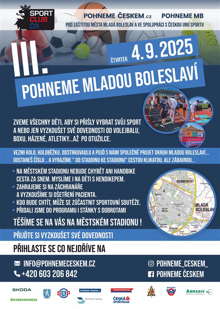 MLADÁ BOLESLAV- Velká přehlídka sportů a místních oddílů se uskuteční ve čtvrtek 4. září od 8:30 do 18:00 na městském stadionu. Dopoledne je akce určena žákům základních a studentům středních škol z Mladé Boleslavi a okolí, odpoledne zve rodiny s dětmi i širokou veřejnost. Organizátoři očekávají účast zhruba 3 až 3,5 tisíce lidí.