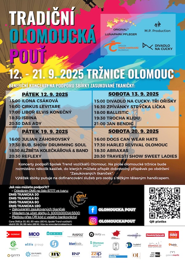OLOMOUC – Olomoucká tržnice se od 12. do 21. září promění v místo plné hudby, kolotočů a dobré nálady. Tradiční olomoucká pouť totiž i letos nese benefiční rozměr – výtěžek kulturního programu poputuje na podporu Spolku Trend vozíčkářů a jejich kultovní sbírky Zasukované tkaničky. Na pódiu vystoupí hvězdy české hudební scény, divadla i lokální umělci.