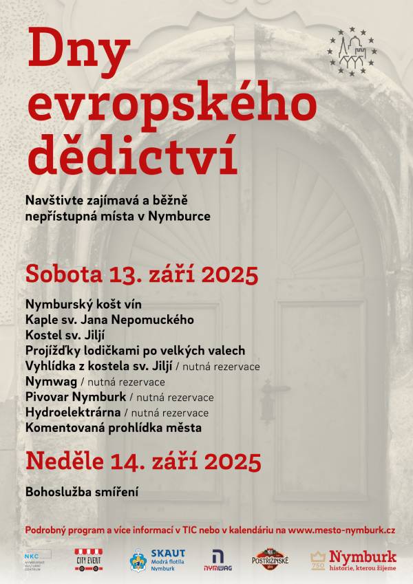 NYMBURK – Otevřené památky a běžně nepřístupná místa, komentované prohlídky, projížďky lodičkami po Velkých Valech a vinný košt v Parku Pod Hradbami – takový program nabídnou Dny evropského dědictví. Konají se o víkendu 13.–14. září 2025 a většina akcí je zdarma; u vybraných prohlídek je kvůli omezené kapacitě nutná předchozí rezervace.