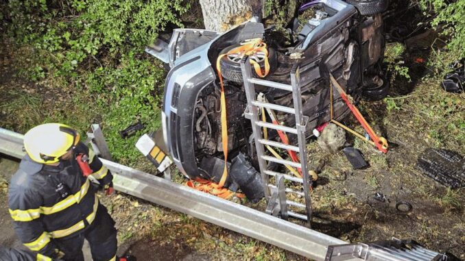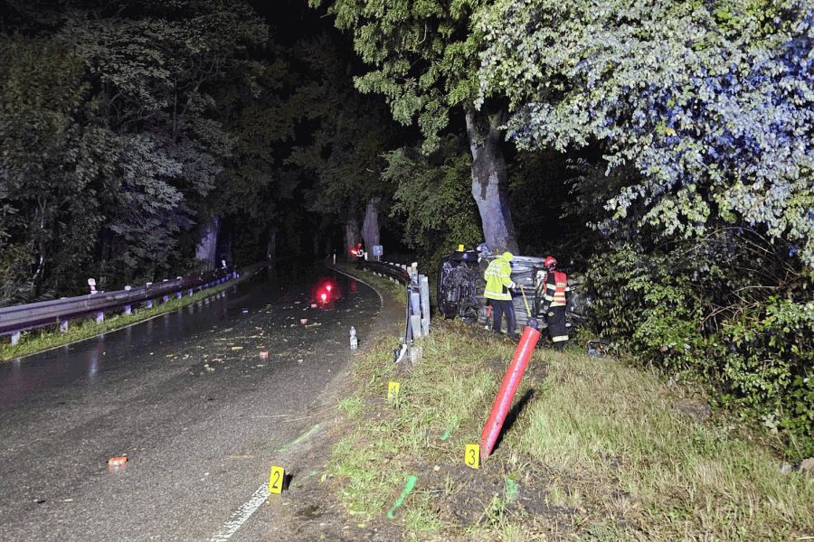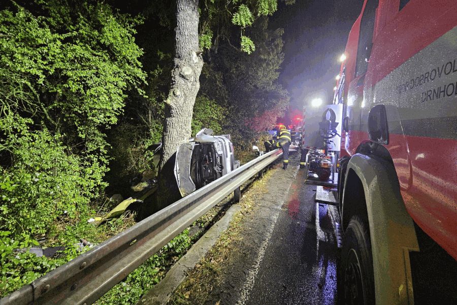 Ve středu před 21. hodinou vyjely jednotky hasičů k hlášené nehodě nedaleko Drnholce. Po příjezdu na místo události hasiči zjistili, že vozidlo se nachází mimo komunikaci, na boku a střechou deformované o vzrostlý strom. Ve voze jely celkem tři osoby. Velitel zásahu rozhodl o stabilizaci vozidla proti dalšímu pohybu. K záchraně zraněných z vraku vozidla hasiči použili vyprošťovací zařízení. „Za necelých padesát minut od ohlášení události na tísňovou linku byly všechny osoby z automobilu vyproštěny a předány do péče posádek záchranné služby. Kromě špatně přístupného místa celý zásah dále komplikoval vytrvalý déšť,” uvedl mluvčí hasičů Filip Venclovský. Po zadokumentování nehody zasahující hasiči převrátili vůz zpět na kola a uklidili komunikaci a blízké okolí od trosek.