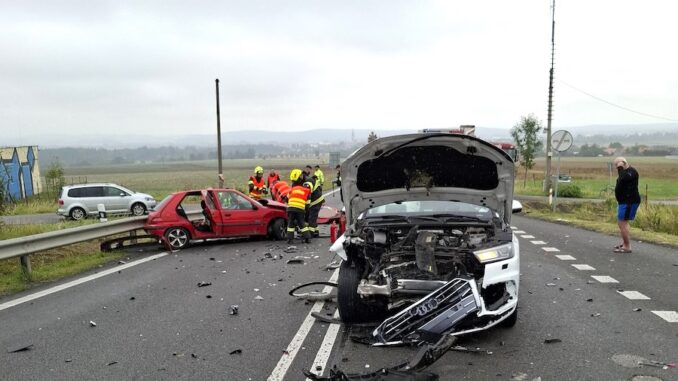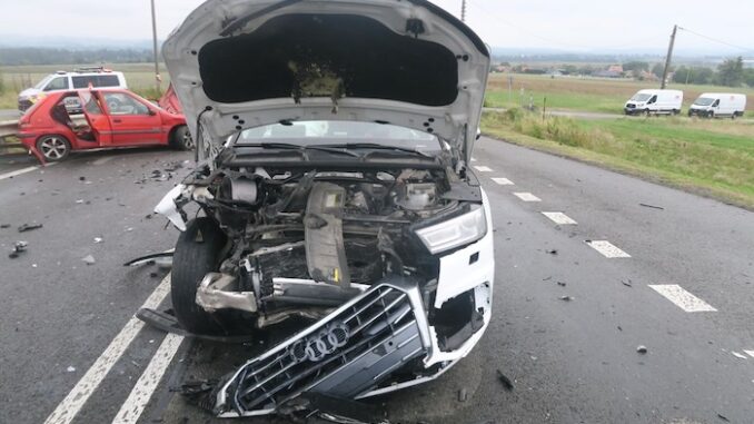 Dva zraněné si vyžádala nehoda dvou osobních aut, která se stala ve čtvrtek 18. září u Podolí u Mohelnice. „Šestašedesátiletá žena jela dopoledne s vozem zn. Peugeot 106 po místní komunikaci od Křemačova. Na křižovatce nedala přednost v jízdě vozu zn. Audi Q5 s 69letým řidičem, který jel od Mohelnice,“ vysvětlila příčinu nehody policejní mluvčí Tereza Neubauerová. Při srážce se zranila řidička a její spolujezdec. Zraněnou řidičku museli nejprve hasiči ze zdemolovaného auta vyprostit, poté ji předali posádce záchranářského vrtulníku, zraněného spolujezdce převezla do nemocnice sanitka. Dechová zkouška vyloučila vliv alkoholu u řidiče Audi, u řidičky Peugeotu nebylo možné dechovou zkouškou provést kvůli zranění, proto u ní byl nařízen odběr krve. Způsobenou škodu policisté předběžně vyčíslili na 330.000 korun.