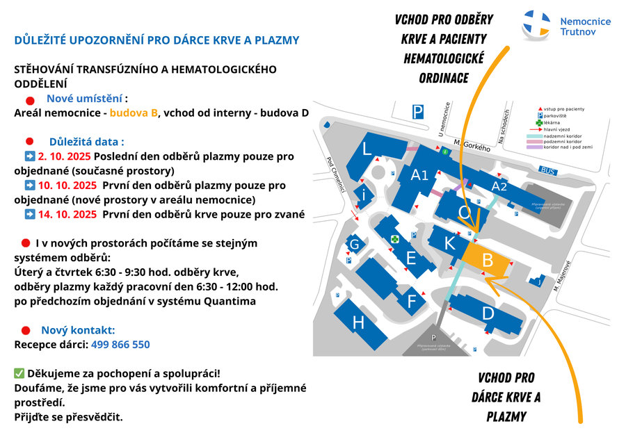 TRUTNOV – Nemocnice informuje veřejnost, že v nejbližších dnech čeká transfúzní oddělení a hematologickou laboratoř přesun do nových prostor v areálu nemocnice. Aby i v průběhu tohoto stěhování byla zajištěna dostatečná zásoba krve a krevní plazmy pro pacienty, nemocnice vyzývá všechny dárce k mimořádné pomoci.