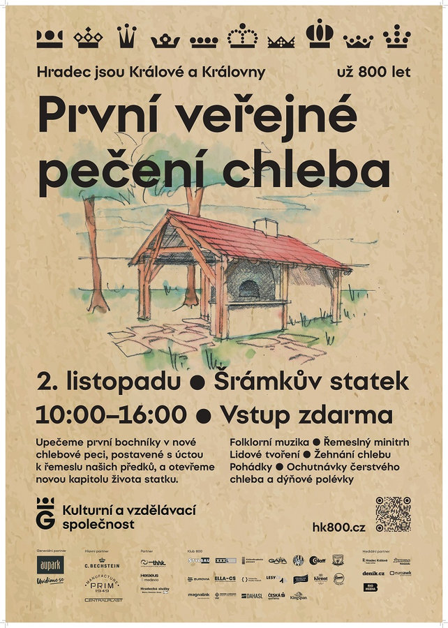 Program začne v 10 hodin otevřením areálu a řemeslného minitrhu. Od 11 hodin se budou sázet první bochníky do pece a krátce před polednem je pekaři vyjmou, nechají vychladnout a nabídnou první ochutnávky spolu s teplou dýňovou polévkou zdarma. Pečení bude pokračovat i v dalších hodinách, vše doprovodí muzika folklorního souboru Kvítek z Hradce Králové.