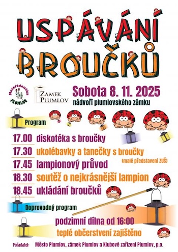 Co: Tradiční akce pro děti na zámku Plumlov. Program: 17.00 hodin diskotéka s broučky, 17.30 ukolébavka a tanečky s broučky, 17.45 lampionový průvod, 18.30 soutěž o nejkrásnější lampion, 18.45 ukládání broučků. Od 16.00 hodin se uskuteční podzimní dílna. Teplé občerstvení zajištěno.