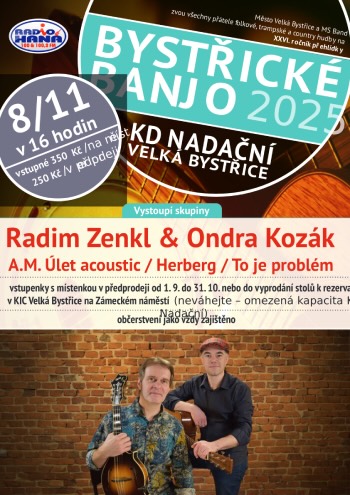 Co: Na letošním 26. ročníku tradiční přehlídky folkové, trampské a country hudby by měli být největším tahákem multiinstrumentalisté Radim Zenkl & Ondra Kozák. Jejich mistrovství v ovládání různých nástrojů a žánrů hudby nadchne každého fanouška muziky nejen v oblasti country a bluegrassu. Dále se můžete těšit na folkrockovou formaci A. M. Úlet z Mohelnice pod vedením Honzy Adamce, která je v našem kraji léta dobře známa. Oblíbené „spirituálovky“ zahraje další regionální kapela To je problém z Kostelce. Tradiční bluegrass s českými texty představí vítěz loňského předkola Banjo Jamboree, kapela Herberg z České Třebové.