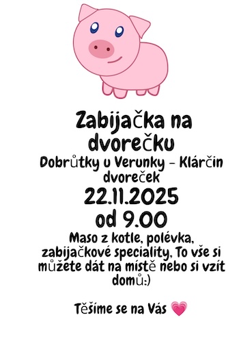 Co: zabijačka na dvorečku, přijďte se pobavit a dát si něco dobrého. Akce bude trvat do vyprodání zásob.