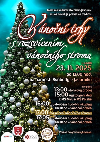 Co: od 13:00 stánkový prodej, v 15:00 vystoupení dětí z mateřských škol, v 17:00 rozsvícení vánočního stromu, v 16 a 17:05 hodin se můžete těšit na hudební vystoupení