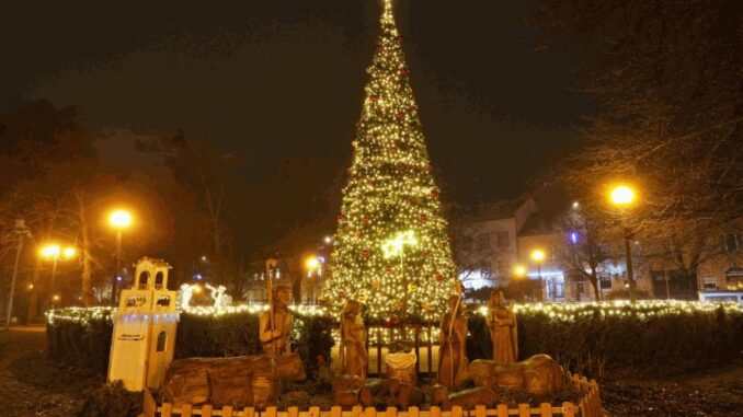 BŘECLAV – Rozsvícení vánočního stromu v Břeclavi bylo letos jiné než každoročně. Vánoční borovici v břeclavském parku nahradil nový umělý strom, který tam nechalo nainstalovat břeclavské muzeum.