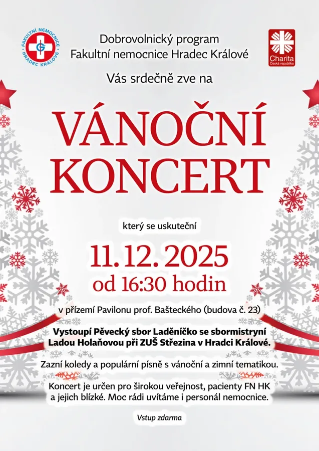 HRADEC KRÁLOVÉ – Fakultní nemocnice připravuje pro své pacienty i obyvatele města předvánoční hudební setkání. Ve čtvrtek 11. prosince 2025 od 16:30 hodin ožije přízemí Pavilonu profesora Bašteckého tradičním vánočním koncertem, který pořádá Dobrovolnický program FN HK. Cílem je přinést do nemocničního areálu atmosféru klidu, naděje a společného prožitku v čase adventu.