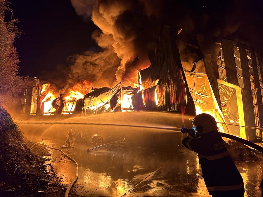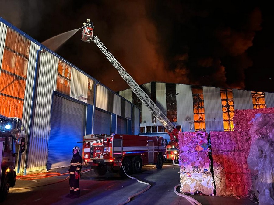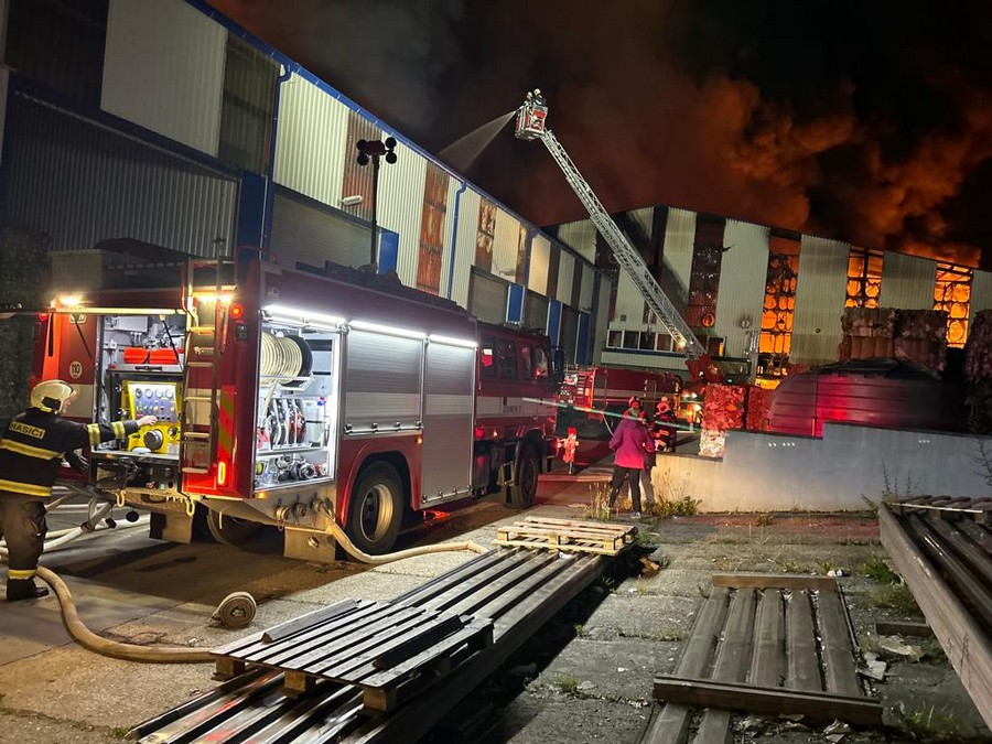 Velitel zásahu během po prvotním průzkumu informoval, že se jedná o halu – recyklační linku separovaného odpadu, která hoří v plném rozsahu a uvnitř které je naskládaný odpad. Na hořící halu je stavebně přímo přilehlá další hala, ze které hasiči vyvezli ven stroje a kterou se snaží před požárem chránit ochlazováním. Jako další posilové jednotky na požářiště přijeli profesionální hasiči ze stanice Strakonice a jednotky SDH obcí Stachy a Budilov.