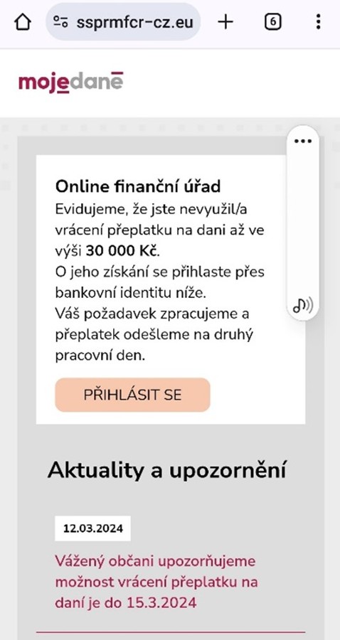 Podvodníci zneužívají logo Finanční správy ČR a portálu MOJE daně. Po zvednutí telefonu vám hlasový automat oznámí, že máte přeplatek na daních, například ve výši 30 tisíc korun. Volající simuluje číslo vašeho finančního úřadu. Následně vám v SMS zprávě dorazí odkaz na podvodnou stránku portálu MOJE daně, kde se z vás po přihlášení do falešného portálu snaží vylákat citlivé osobní informace a přístupové údaje k vašemu bankovnictví.