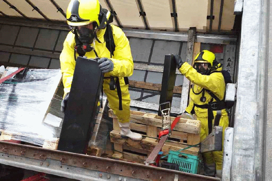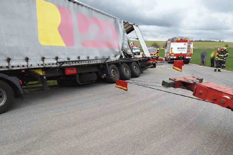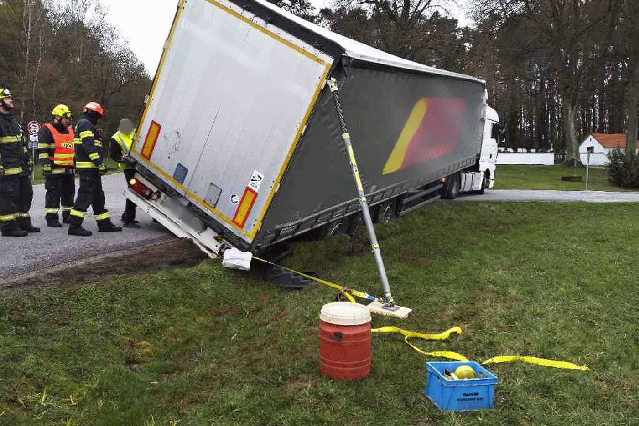 Souprava kamionu s návěsem, která převážela akumulátory, v obci Podmyče na Znojemsku částečně sjela mimo komunikaci a hrozila převrácením. Jak popsal mluvčí hasičů Filip Venclovský, z některých akumulátorů unikal elektrolyt, který hasiči zachytávali do připravených nádob. Návěs proti dalšímu nežádoucímu pohybu zajistili a ve speciálních ochranných oblecích a dýchací technice zamezili uvnitř návěsu dalším únikům. Za využití navijáků ze dvou vyprošťovacích automobilů vyprostily jednotky havarovanou soupravu zpět na silnici před 17. hodinou. „Nehoda se obešla bez zranění, doplnil Venclovský.