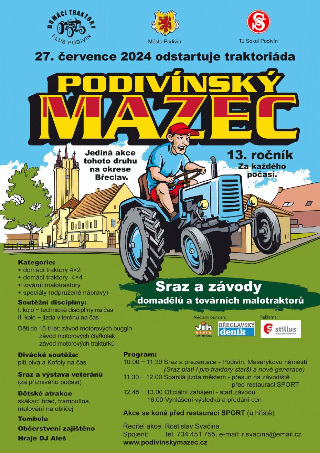 V Podivíně proběhne již 13. ročník traktoriády Podivínský Mazec. Sraz traktoristů bude v sobotu 27. července v 10 hodin před podivínskou radnicí, kde bude registrace. Podivínský Mazec odstartuje od restaurace Sport v Podivíně v jednu hodinu odpoledne. Těšit se můžete na závod a soutěžní disciplíny v různých kategoriích, Nově pro děti do 15 let pořádají závod motorových bugin, čtyřkolek, traktůrků a dalších nezávodních vlastních strojů.. Bezpečnostní výbava je nutná. „Za příznivého počasí bude i sraz a výstava veteránů, pro nejmenší mega skluzavka SpongeBob, trampolína a spoustu další zábavy,“ slibují pořadatelé. Proto nezapomeňte na Traktoriádu v sobotu 27. 7. v Podivíně. Více informací najdete na stránce www.podivinskymazec.cz.