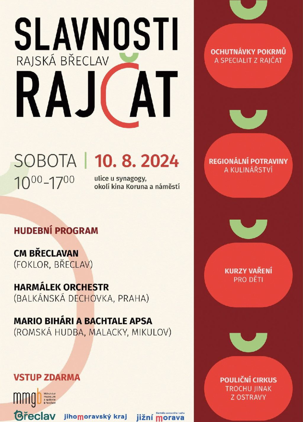 Slavnost rajčat nabídne všemožné barevné i chuťové variace plodiny typické pro Břeclav a okolí. „V letošním roce slavnosti podpořila Centrála cestovního ruchu jižní Moravy, která je zařadila mezi TOP gastronomické a kulinářské akce v kraji. Rajská Břeclav se tak dostala do prestižní společnosti tradičních Slavností chřestu v Ivančicících, Slavností mandloní v Hustopečích a dalších akcí s mnohaletou tradicí,“ pochlubil se místostarosta Petr Vlasák. Těšit se můžete na zajímavé rajské speciality jako rajský langoš nebo rajčata ve spojení s hmyzími specialitami, quesadillas, španělské paelly či studené polévky gazpacho. Rajská Břeclav nabídne rajčata sušená, drcená, fermentovaná a všemožně zpracovaná do nepřeberného množství dobrot. Ochutnat budete moci rajský burčák neboli „rajčák“ či rajčatovou limonádu. „Letos bude v nabídce i rajský pivní speciál plný rajčat a bazalky, který vytvořil břeclavský pivovar Frankies ve spolupráci s Fermato,“ vysvětlil Vlasák. Originální kvašené rajčatové omáčky Fermato vznikly právě jako produkt břeclavských Slavností rajčat. První sklenice se prodaly právě tam a dnes už jsou stabilně a úspěšně usazené na trhu. Prodejní stánky budou otevřené od 10 hodin, kdy také odstartuje program na dvou scénách. Vstup na akci je zdarma.