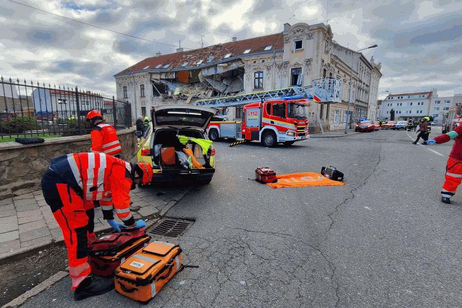 V neděli po 11. hodině přijalo operační středisko jihomoravských hasičů zprávu o explozi v bytovém domě ve Znojmě. K místu události vyjely jednotky z prvního stupně požárního poplachu, které se ihned po svém příjezdu soustředily na záchranu osob z poškozeného objektu. Za využití automobilového žebříku zachránili hasiči z druhého podlaží budovy čtyři osoby, další tři osoby pomocí nastavovacích žebříků. Průzkumem vnitřku budovy nalezli muže zavaleného sutinami. Toho vyprostili a na páteřové desce transportovali ke zdravotníkům. Celkem si událost vyžádala osm zraněných osob. „Jedna osoba utrpěla těžké zranění, po ošetření byla letecky transportována na urgentní příjem Fakultní nemocnice Brno, středně těžce zraněný pacient byl po poskytnutí přednemocniční neodkladné péče převezen sanitkou do znojemské nemocnice. Šest lehce zraněných lidí jsme po ošetření transportovali do stejného zdravotnického zařízení,” popsala mluvčí záchranářů Michaela Bothová.