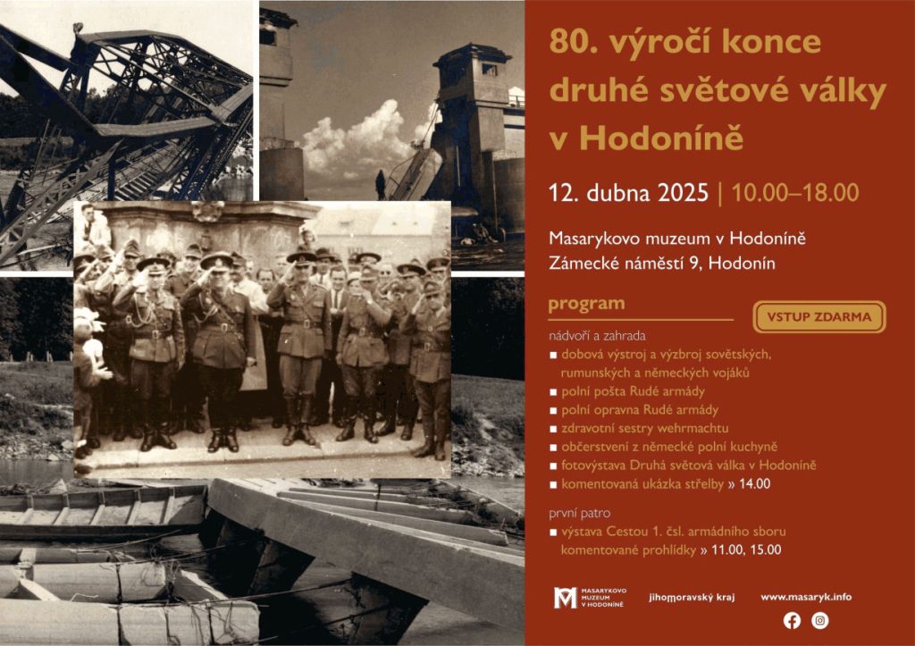 V sobotu 12. dubna se v prostorách zámečku Masarykova muzea v Hodoníně uskuteční celodenní vzpomínková akce k 80. výročí konce druhé světové války v Hodoníně. Muzeum si připravilo ukázky polní pošty RKKA, která bude v sobotu v Masarykově muzeu v Hodoníně připravena zaslat pohlednice vašim blízkým. Díky současné české poště i s frontovými termíny. V sobotu zjistíte v muzeu, jak fungovala polní prádelna, jak probíhalo odvšivení, oprava uniforem a jejich součástí, jak pracoval polní švec. Do bojů o Hodonín se zapojili v roce 1945 i vojáci Rumunské královské armády. Také jejich výstroj a výzbroj uvidíte. Německé zdravotní sestry představí nástroje, přístroje a další zdravotnické vybavení využívané v polních nemocnicích v těžkých dobách války. Zajímá vás, jak se připravuje strava v polní kuchyni? V sobotu vám vojáci wehrmachtu uvaří polévku, nabídnou chleba s pomazánkou a čaj. Současně představí dobovou německou vojenskou výstroj a výzbroj. Zároveň si nenechte ujít krátkou přednášku o zbraních a ukázku střelby z kulometu Maxim a ukázku střelby z protitankové pušky.