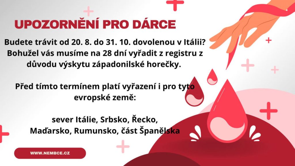 Vyřazení platí pro všechny, kteří od 20. srpna do 31. října navštíví celou Itálii. Důvodem je výskyt západonilské horečky, kterou přenášejí komáři. „Pokud jste tedy v létě byli v těchto zemích, prosím, odložte návštěvu transfuzky. Ale nezapomínejte na nás. Děkujeme, že pomáháte,” požádala nemocnice Boskovice
