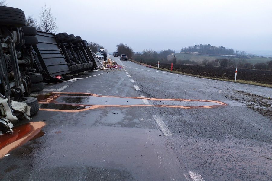 Řidič polského kamionu vyvázl bez zranění, hasiči ho nemuseli vyprošťovat. Na místě uniklo větší množství nafty z nádrží, ze kterých ji hasiči museli přečerpat. Zasahovaly profesionální jednotky hasičů ze tří stanic. Silnice je částečně průjezdná, zásah komplikovala vysypaná jablka. Probíhá vyprošťování soupravy a odklízecí práce. Zdejší hlavní tah na Rakousko je obousměrně uzavřen.